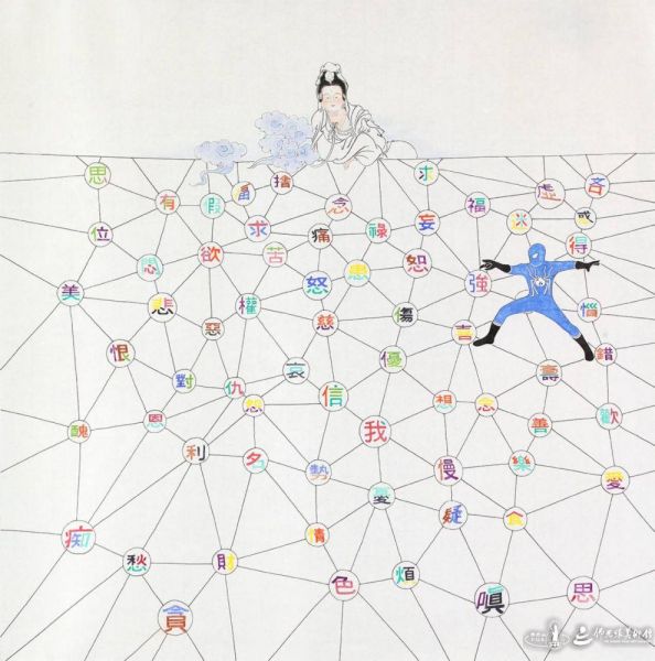 例如,〈菩薩與蜘蛛人〉、〈思考的窗〉,映照畫家對內心波動與情緒變化的細膩覺察;